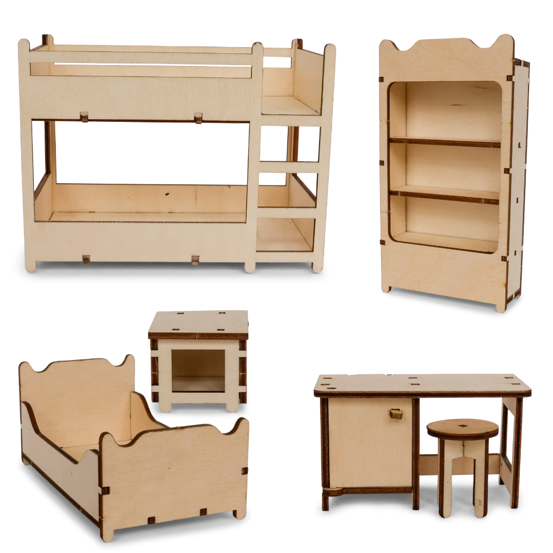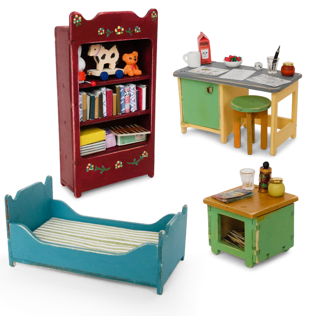 ¡Crea un mini dormitorio infantil con este kit de muebles! Las piezas de madera precortadas se ensamblan fácilmente con instrucciones sencillas y tienen una escala de 1:12. Basado en la serie de libros "La Mansión del Ratón" de Karina Schaapman, este kit te permite dar vida al encantador mundo de Sam y Julia. Este kit de muebles incluye un moisés, una cuna, un cambiador, una mecedora, un armario, un baúl de juguetes, algunos juguetes pequeños y estantes. La pintura, el pegamento y los accesorios se venden por separado.