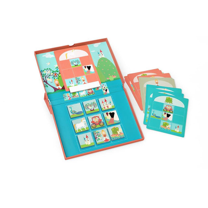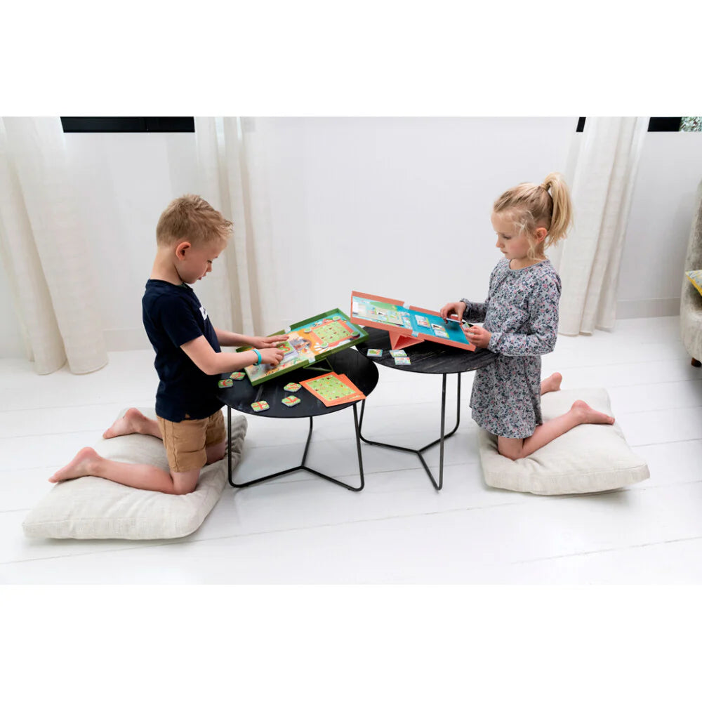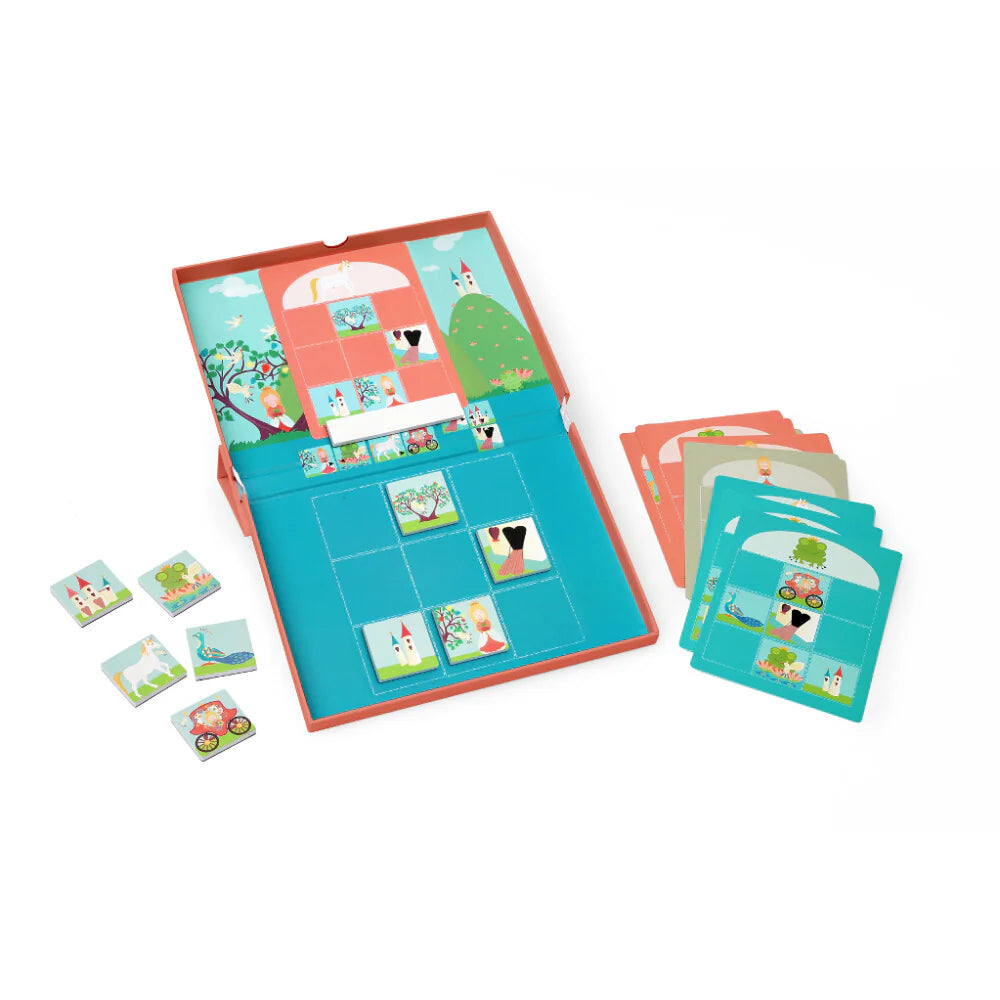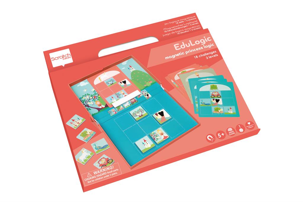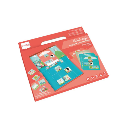 Hay 18 tarjetas de tareas diferentes. Toma una tarjeta de tarea y pégala con el imán en la parte superior de la Caja Edulogic. Copia la tarjeta con las figuras correctas en la parte inferior. Usa las fichas magnéticas para esto. Ahora intenta llenar los espacios vacíos de la tarjeta de tarea encontrando las figuras que faltan correctamente. Observa la serie en el centro de la Caja Edulogic. ¿Quién o qué va junto? Por ejemplo, la princesa siempre debe colocarse a la izquierda de la rana (o la rana a la derecha de la princesa), el unicornio debe colocarse a la izquierda del carruaje (o el carruaje a la derecha del unicornio) y la puerta del castillo debe colocarse a la izquierda del castillo o debajo del castillo. ¿Has logrado completar el dibujo? Da la vuelta a la tarjeta de tareas y comprueba en la tarjeta de soluciones si has completado la tarea correctamente. Este juego estimula el pensamiento lógico.