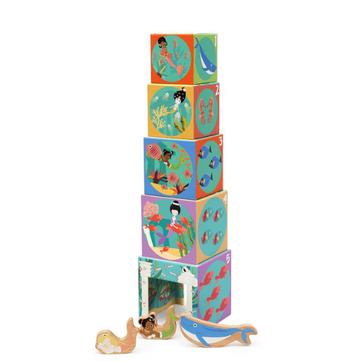 Esta torre apilable educativa de alegres colores, con 5 cubos de diferentes tamaños, se puede apilar uno sobre otro y colocar uno junto al otro como un rompecabezas. Intenta armar el rompecabezas oculto colocando los bloques con los lados correctos uno al lado del otro. Los 5 lados están decorados con criaturas marinas, sirenas y números para enseñar a los niños a apilar, armar rompecabezas, contar y reconocer objetos. El bloque apilable más grande tiene forma de casita de juegos para las figuras de madera incluidas.